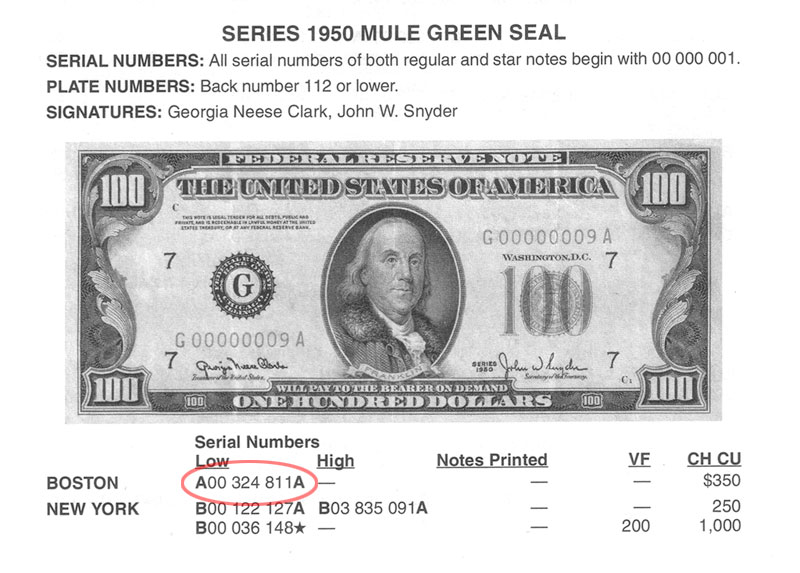 One hundred dollar bills from 1950 to present values and pricing.